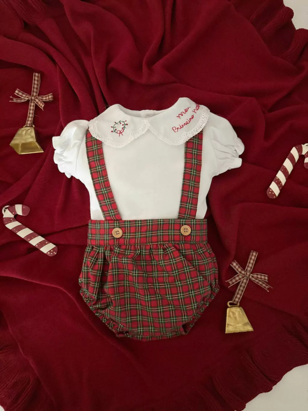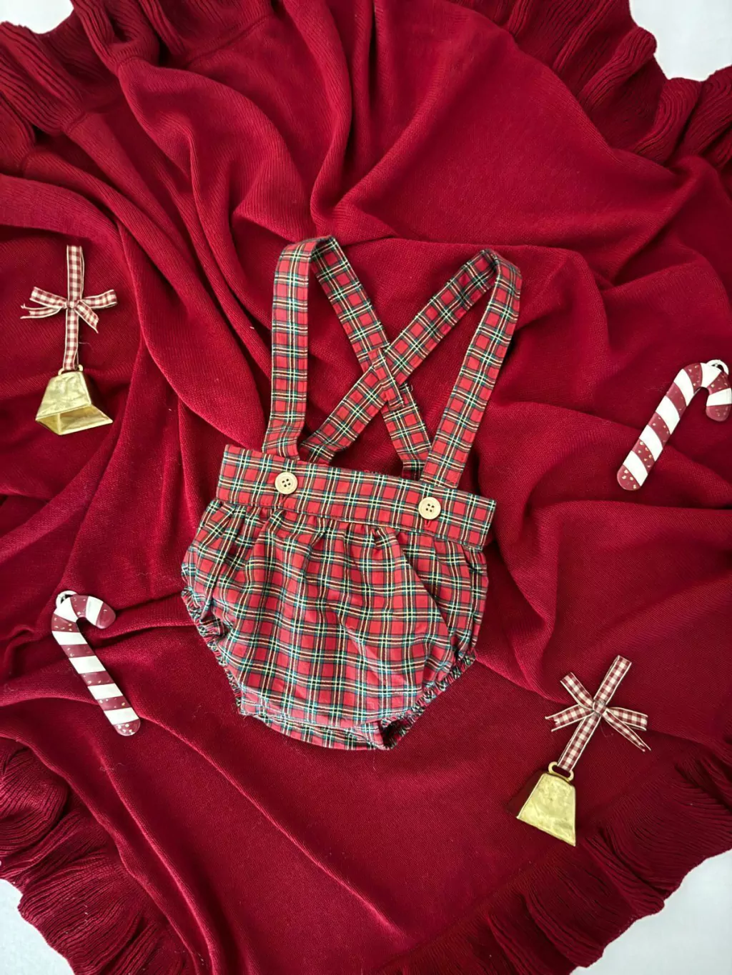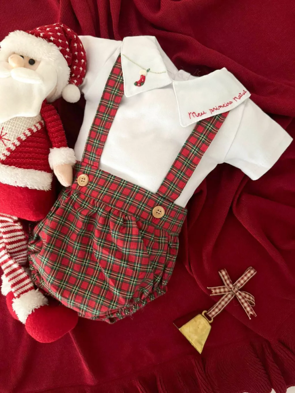 Bloomer Suspensório em xadrez vermelho, verde e dourado, perfeito para o seu pequeno se encantar com o seu Primeiro Natal!