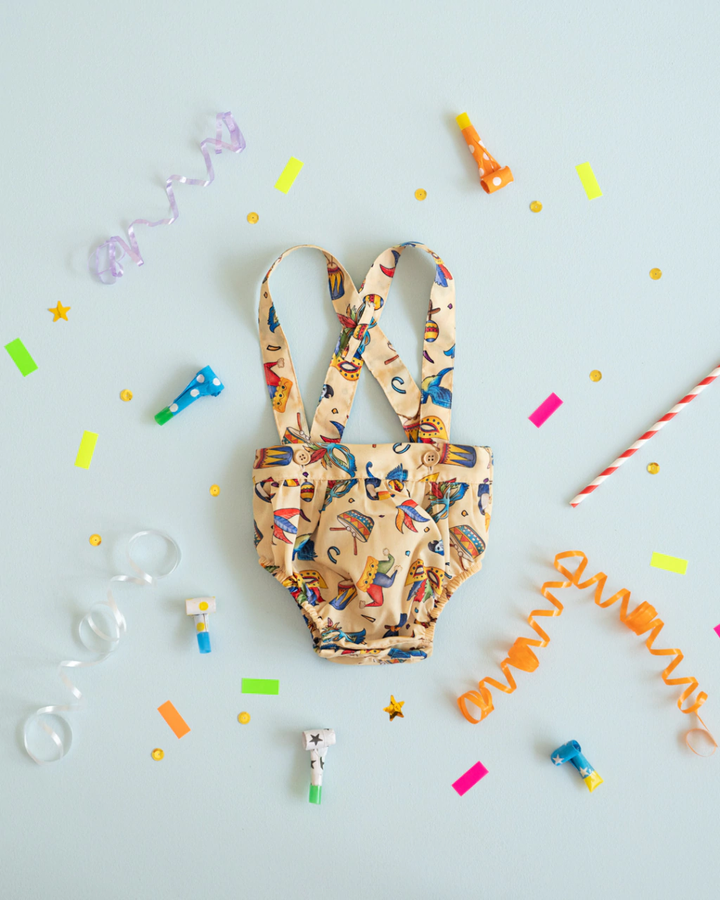 Bloomer Suspensório estampado com tema de carnaval. Fundo Amarelo claro com elementos: tan-tan, mascara, chocoalho, araras.