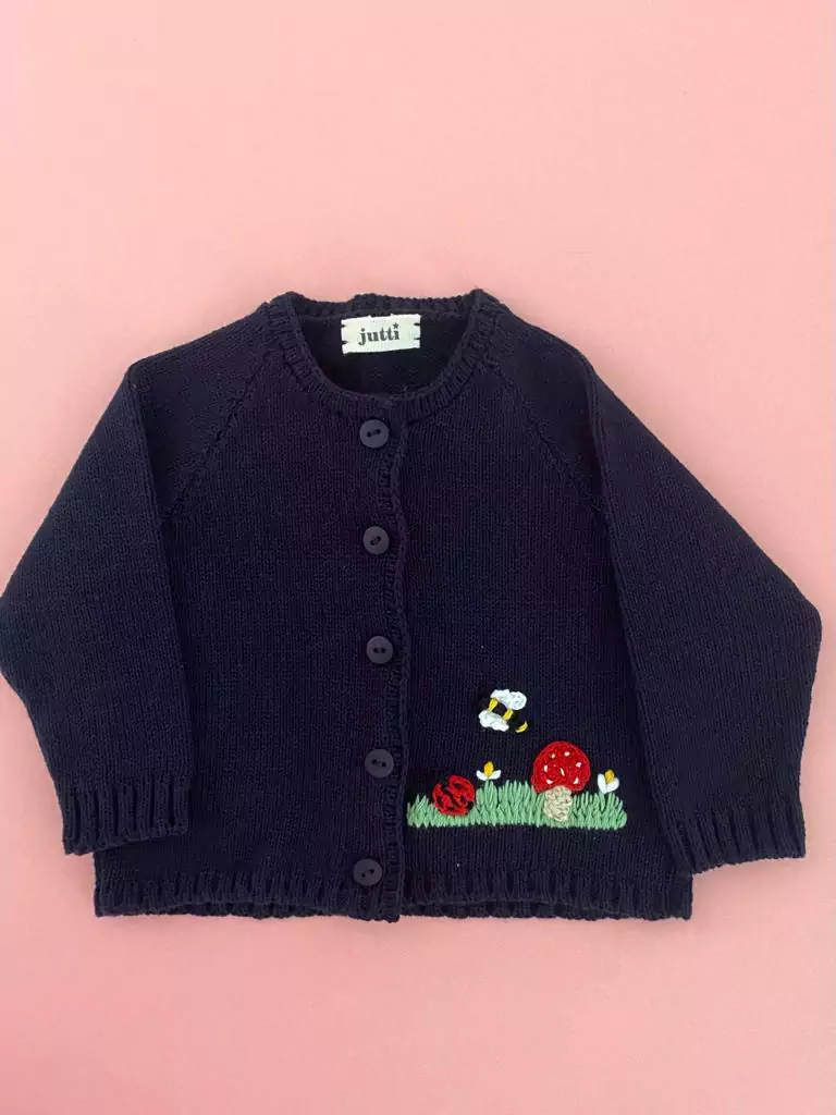 Casaquinho feito em tricô antialérgico com bordados de cogumelos feito à mão.