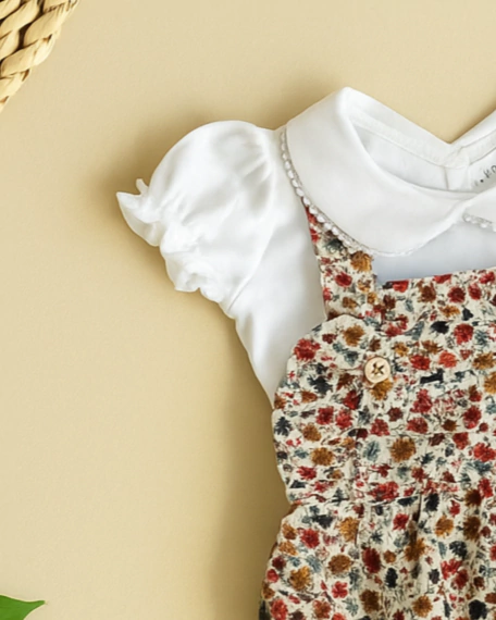 Jardineira com feita em tecido tricoline em estampa liberty de jardim secreto em miniatura, com florzinhas delicadas em